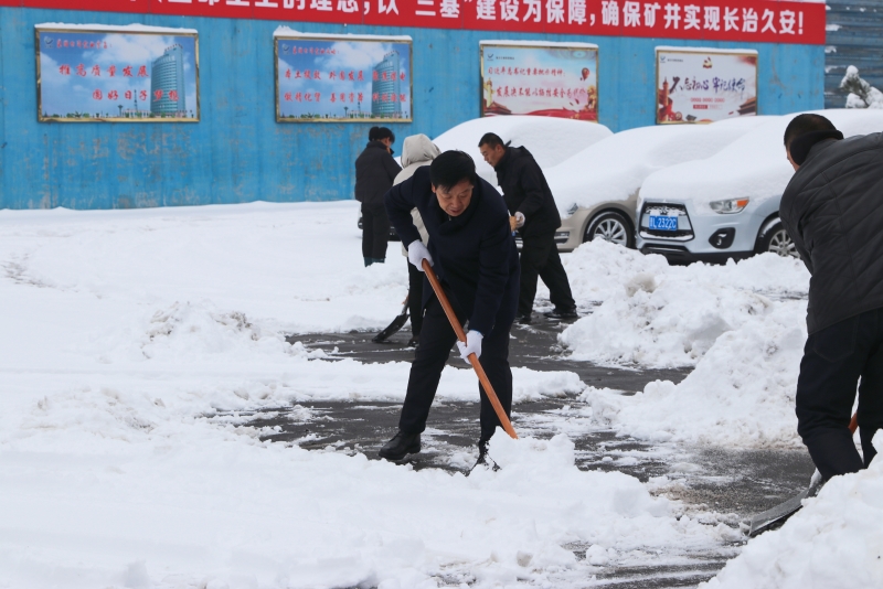 雪后雖然處處是美景,但也給職工出行帶來堵多不便。為了消除積雪帶來的不便和安全隱患,在崗職工自發拿起鐵鍬、掃帚,清掃礦內道路冰雪。